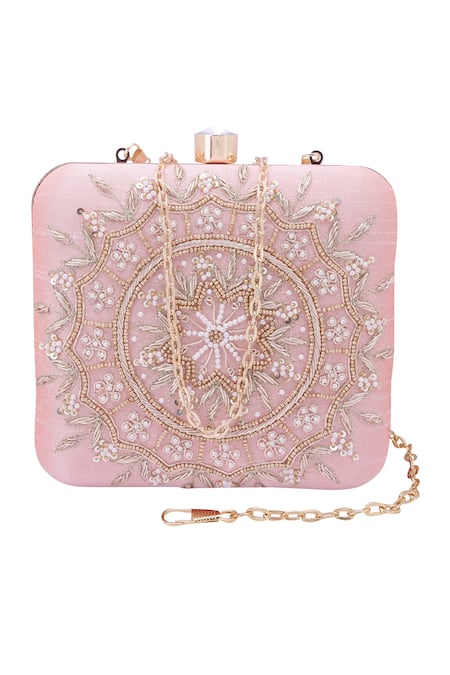 A blush pink silk box clutch featuring a central mandala motif embroidered with golden beads, sequins, and white pearls.