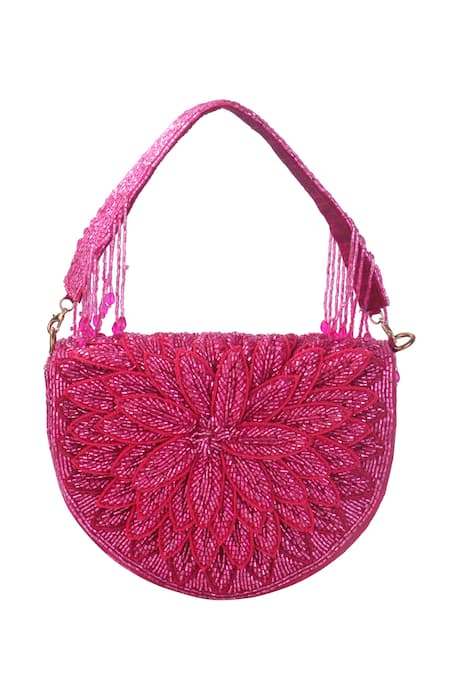 A hot pink flap bag crafted from silk material, featuring intricate bead embroidery in a floral pattern.
