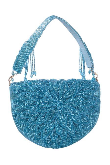 An aqua blue flap bag crafted from silk, featuring a beaded floral pattern on the front.