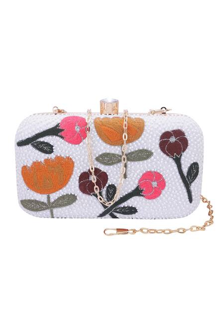 Floral embroidery in multiple colors, White bead embellishments, Crystal top clasp closure