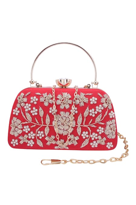 Red Embroidery, Pearls, Crystals Floral Clutch With Detachable Sling