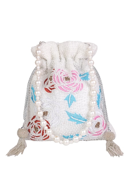 White Beads, Embroidery, Pearls, Tassels Floral Potli Bag With Handle