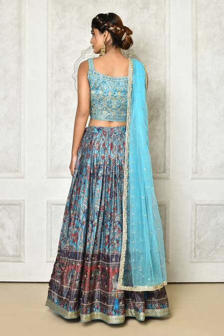 Buy_Samyukta Singhania_Blue Net, Chiffon Embroidery, Zari, Sequins Floral Print Pleated Lehenga Set_Online_at_Aza_Fashions