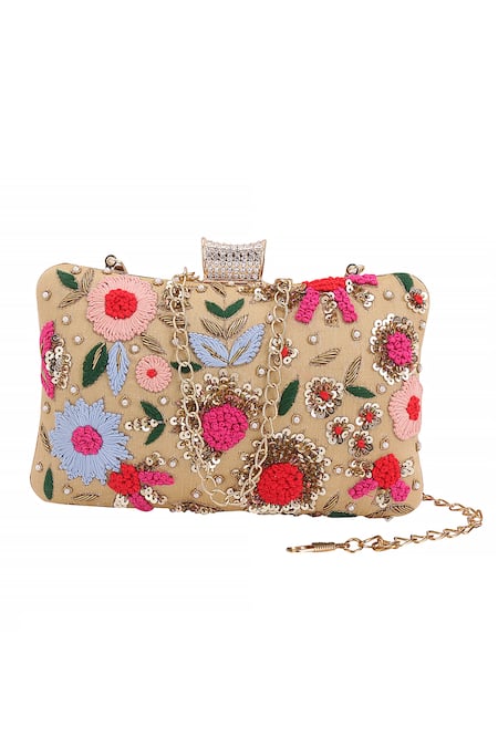 A cream silk clutch bag featuring multicolor floral embroidery with sequins and bead embellishments.