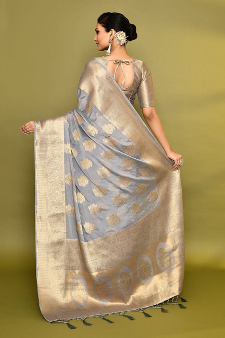 Grey saree featuring woven zari floral-paisley motifs and scalloped border. Paired with a blouse that has a back tie detail.