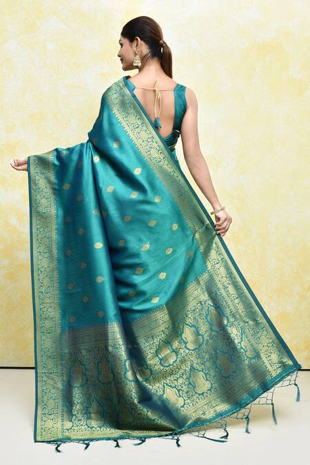 Green saree with all over woven damask blossom motifs. Paired with matching square neck stitched sleeveless blouse.