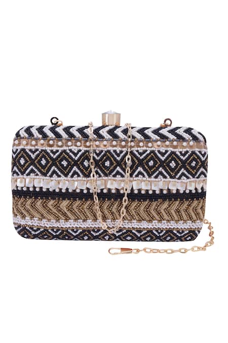 Black Beads, Sequins, Pearls, Stones Geometric Beaded And Embellished Clutch