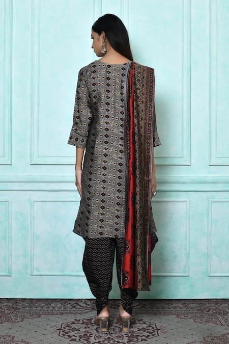 Black kurta featuring geometric prints and embroidery with a V neck and three-quarter sleeves. Paired with a printed dupatta and patiala pant.