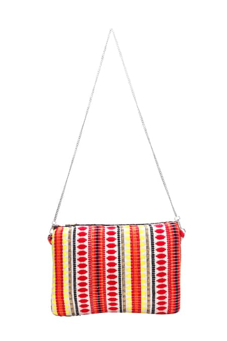 A multi-color silk clutch featuring geometric patterns crafted with sequins, beads, and intricate thread work.