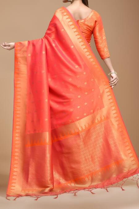 Orange saree crafted in handloom weaving silk blend featuring a jaal pattern with buttis and a heavy border. Paired with a round neckline elbow-sleeve blouse.