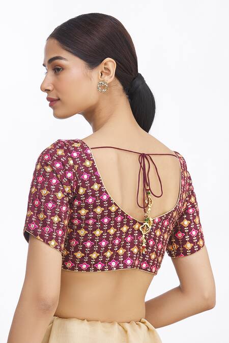 Maroon Jacquard Sequins V-neck Wine Floral Embroidered Blouse