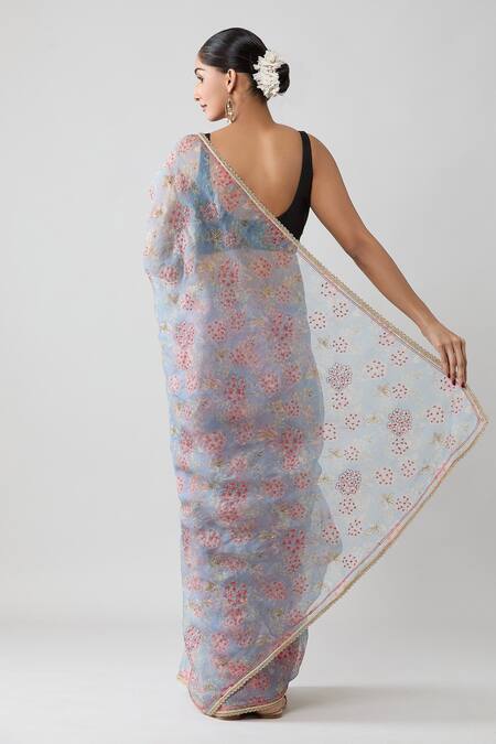 Grey organza saree featuring floral prints with hand embroidered highlights. Paired with a pink embroidered running blouse piece.