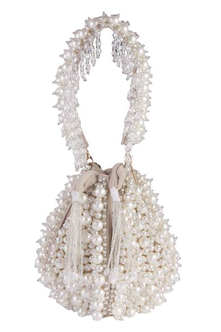 A cream silk potli bag featuring all-over pearl and crystal embellishments.