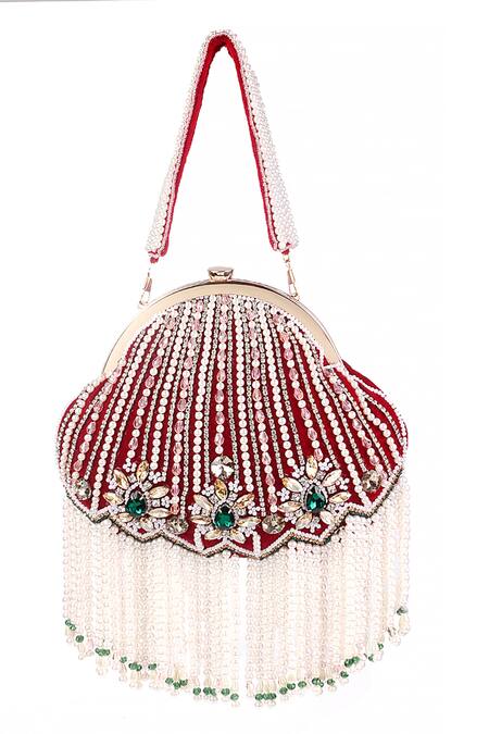 A red silk batua bag featuring pearl and stone embellishments with a metal frame and a detachable handle.