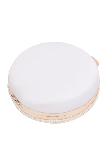 A cream round clutch featuring an exterior adorned with pearl and stone embellishments.