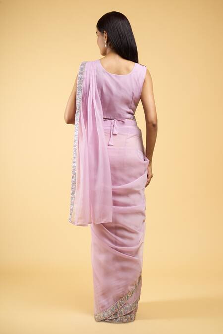Mauve pre-draped saree featuring thread and sequin embroidered border. Paired with floral applique embroidered padded blouse and belt.