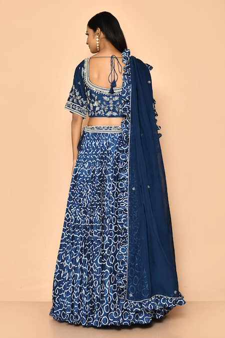 Blue lehenga set featuring a round neck embroidered blouse with sequin and mirror work. Paired with a pleated printed satin skirt and a frilled dupatta.