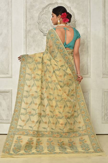 Beige saree with floral printed motifs. Comes with running blouse piece.