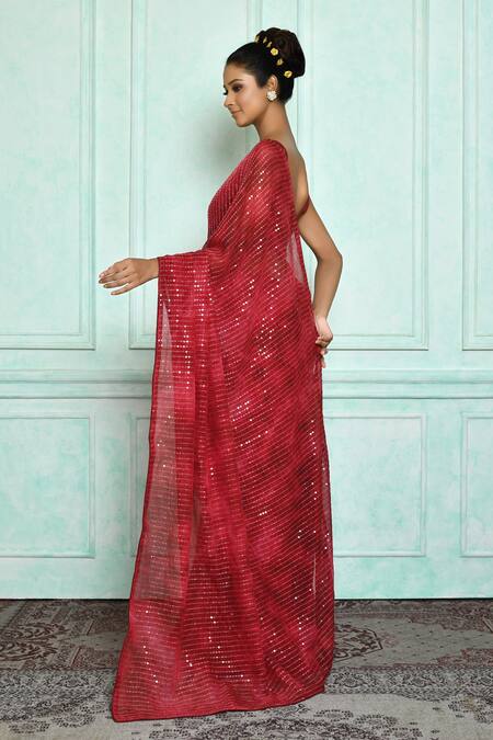 Red saree featuring all-over prism prints and sequin embroidery. Comes with unstitched blouse fabric in banglori satin silk measuring 0.80 mtr.
