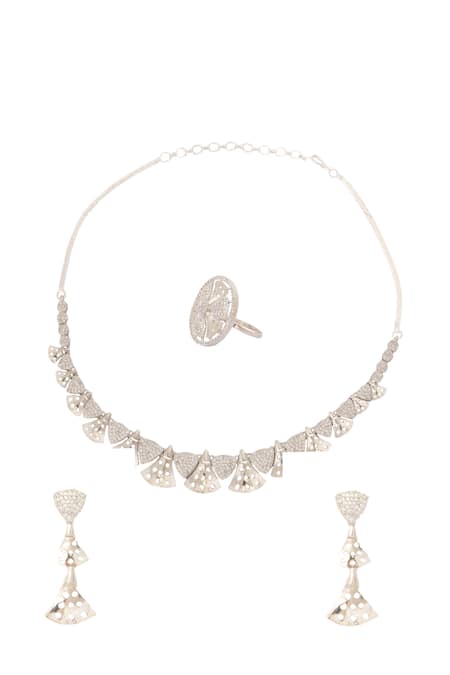 Silver and white embellished necklace featuring intricate American diamond detailing. Accompanied by matching earrings and a decorative ring.