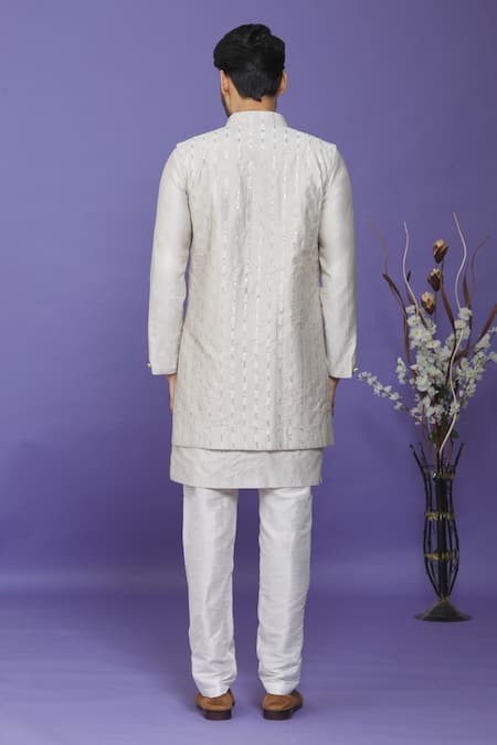 Grey kurta in art banarasi silk featuring a Mandarin collar and full sleeves. Paired with a cream aligadhi pant and a thread embroidered long bundi with a front welt pocket.