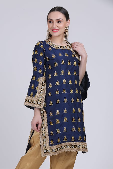 Electric blue kurta with floral embroidered motifs. Paired with salwar.