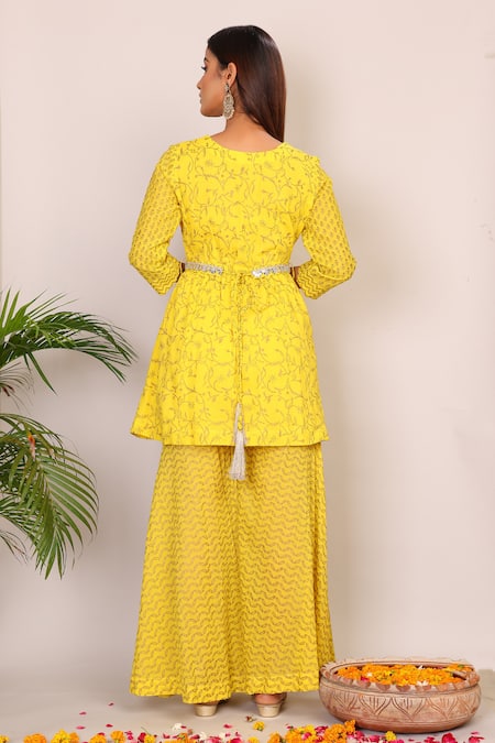 Yellow kurta featuring floral print, V neckline & long sleeves. Paired with a printed palazzo and embroidered belt.