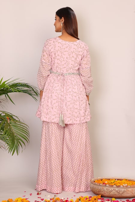 Pink kurta featuring floral embroidery with a V neck and long sleeves. Paired with a printed palazzo and an embroidered belt.