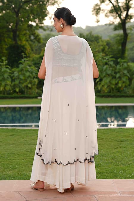 White Georgette Embroidery, Mirrors Scoop Lehenga And Scallop Trimmed Cape Set