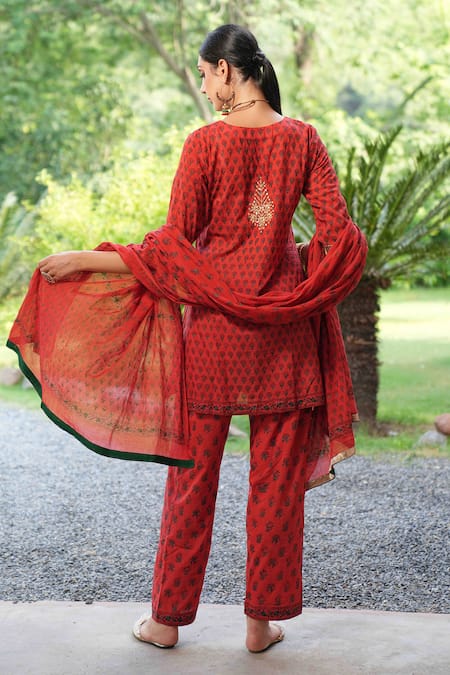 Red straight kurta featuring floral hand block print and hand embroidered placket. Paired with matching pant and dupatta, both in hand block print.