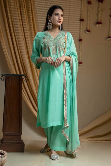 Teal cotton kurta featuring a Kashmiri embroidered yoke and V neck. Paired with a matching pant and dupatta with gota border.