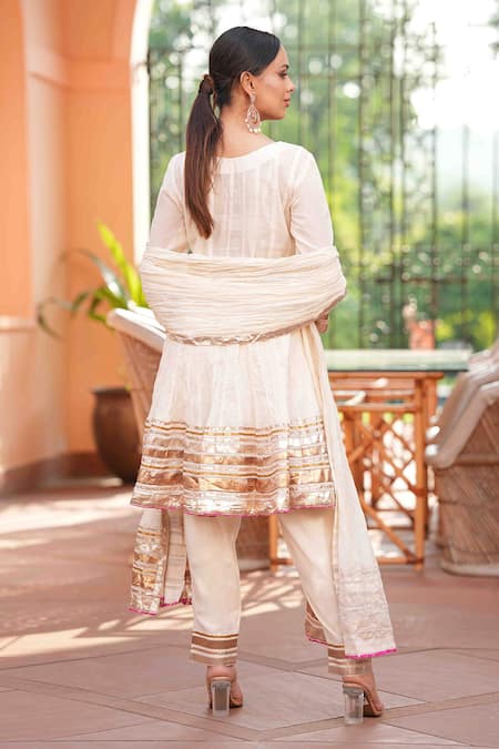 White anarkali featuring gota embroidered hemline and V neck. Paired with matching pant and dupatta, both adorned with gota embroidery.