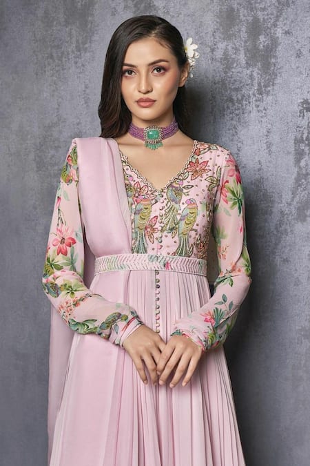 Baby pink anarkali featuring a V neck, full sleeves, and intricate hand embroidery with floral, parrot, sequin, and bead detailing. Paired with a hand embroidered belt and a matching dupatta.