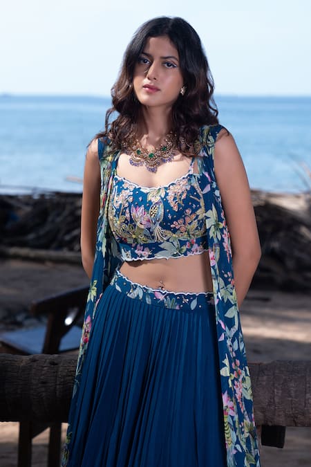 Navy blue lehenga set featuring a padded bustier with floral, sequin, and bead hand embroidery. Accompanied by an open jacket and an attached cancan for added volume.