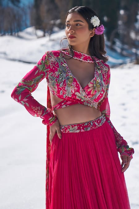 Hot pink lehenga featuring floral and parrot patterns with attached cancan. Paired with a padded wrap blouse adorned with sequin and bead hand embroidery, along with a coordinating dupatta.