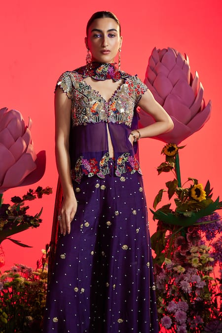 Purple lehenga featuring sequin, bead, and zari embroidery with an attached cancan. Paired with a padded blouse showcasing floral bird motif embroidery and a sheer floral cutwork dupatta.