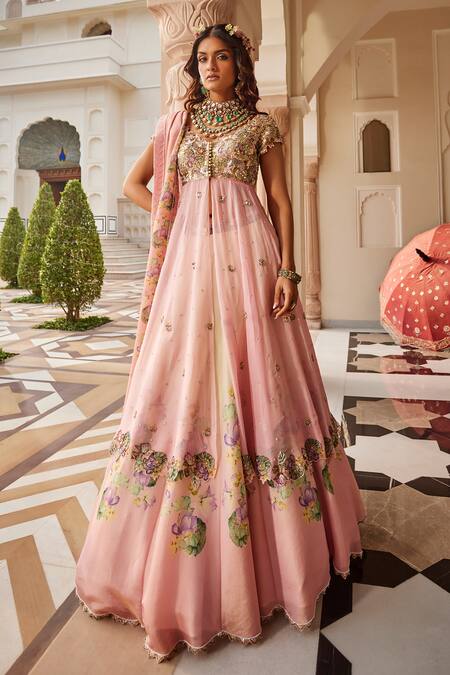 Blush pink designer overlay set featuring a padded blouse, attached can can, and a dupatta. The fabric includes organza for the overlay and tissue for the top and dupatta.