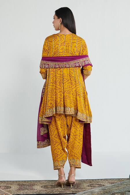 Mustard yellow anarkali featuring all over bandhani pattern with striped mirror, thread, and cut dana embroidery. Paired with a salwar and a contrasting embroidered dupatta.