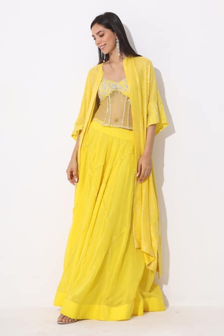 Yellow long cape with all-over embroidery and asymmetrical hem. Comes with embroidered corset and lehenga.