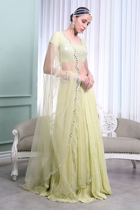 Lime green tiered lehenga with mirror embroidered waist band. Paired with an embroidered choli and dupatta.