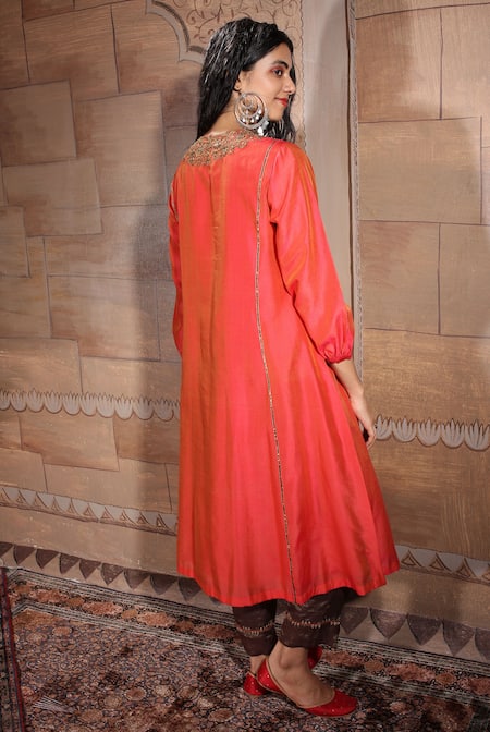 Orange gathered kurta with embroidery and bishop sleeves. Comes with straight pants and dupatta.