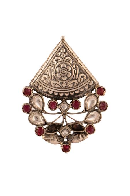 Carved floral detailing on top, Kundan and ruby stone embellishments, Push back clasp closure