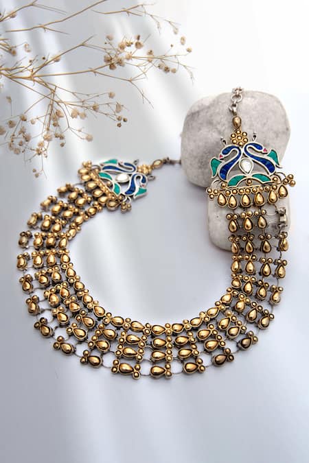 Gold necklace featuring vintage cut work shapes with intricate carved work details