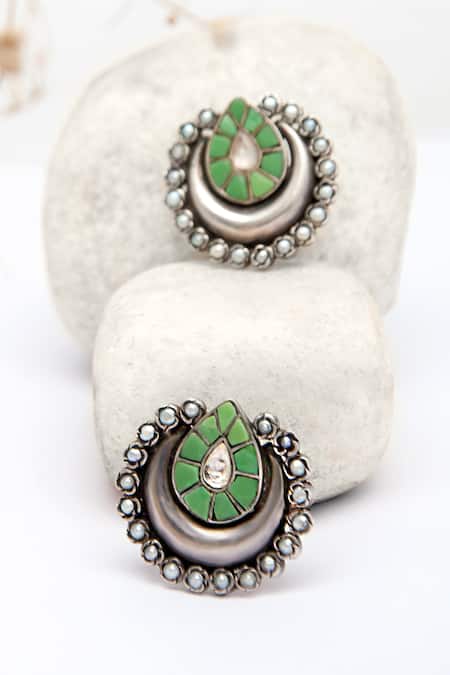 Crescent moon shape with intricate kundan work, Pearl detailing around the edges, Push back closure for secure fit