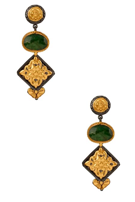 Gold danglers featuring floral carvings and sapphire stone embellishments