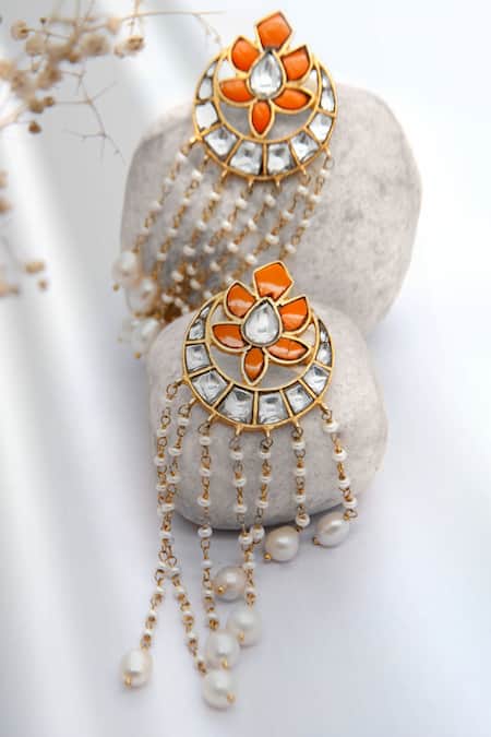 Floral design with orange kundan inlay, Cascading pearl bead chains, Push back closure for secure fit