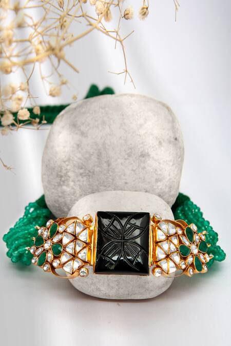 Multi color choker featuring a stone carved pendant with black carved stone, green onyx, and kundan embellishments. Adjustable dori closure for a customizable fit.