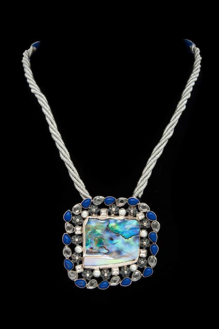 Blue thread necklace featuring a square pendant studded with mother of pearl