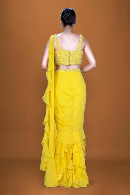 Cadmium yellow pre-stitched saree featuring cascading ruffle detailing. Paired with a crystal, cutdana, bead, and sequin embroidered padded blouse.
