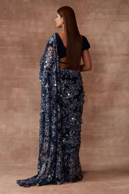 Blue Tulle Embellished Sequin Sweetheart Neck Cosmos Saree With Blouse